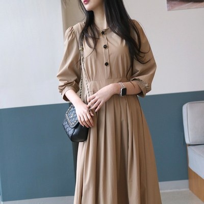 봄 가을 고급 롱 원피스 허리 조임 배색 스커트 정장 셔츠넥 긴팔 여성원피스 D88U