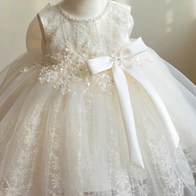 여아용 화이트 레이스 드레스 무소매 리본 퐁퐁스커트 공주복 백일 드레스 돌드레스 80 D-012
