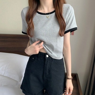 엘쏘 여성용 라운드 넥 시보리 배색 반팔 티셔츠