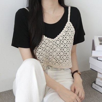 빅사이즈 여성의류 크롭 양두 니트 숏 조끼 미니 뷔스티에 심플 레이어드 끈 베스트 하체 길어보이는 효과 66-110 size