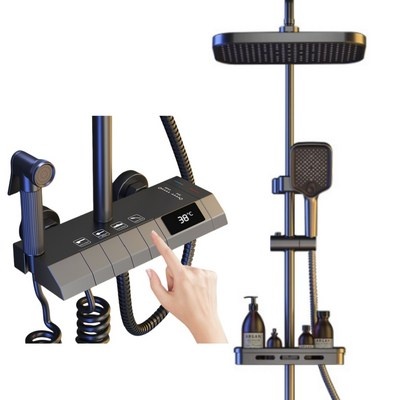 해바라기 샤워기 세트 4단 조절 가능 수온 표시 선반형 수납 가능한 스마트 샤워기 세트, 블랙, 1세트