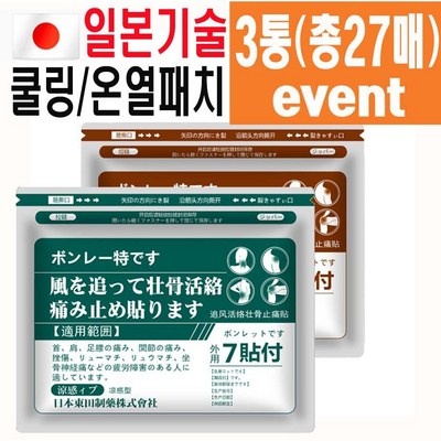 일본기술 근육 쿨링 온열 패치 허브에센스 추풍장고 3통(총27매) 무릎 경추 어깨 패치 허리 빠른침투 바디 테이핑