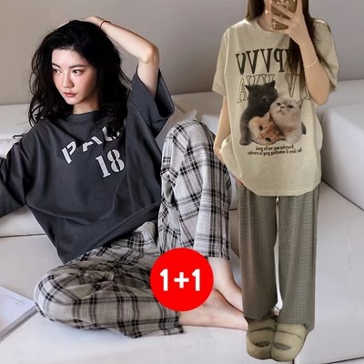 마쿠쿠 1+1 세트 체크 긴바지 여성 반팔티 투피스 잠옷 홈웨어