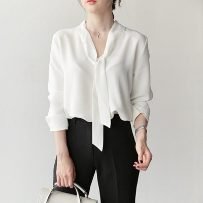 BLACK K7여성오버핏 브이넥 타이블라우스 베이식 데일리 쉬폰 셔츠