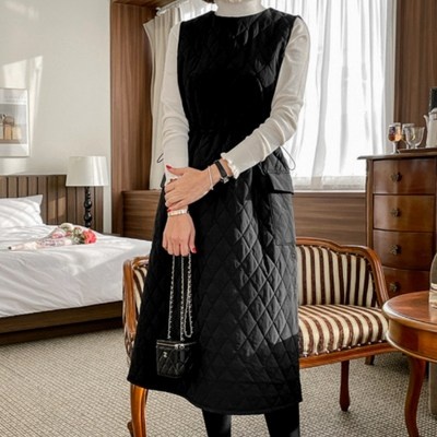 와이투 퀼팅 패딩원피스 겨울 누빔 롱 조끼 레이어드 A라인 바스락 멜빵