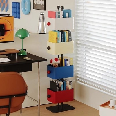 책장 360도 회전 가능한 고급 이동식 책꽂이 거실 책장 선반, 4단, 블루혼합