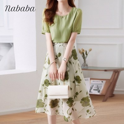 나바바 NB2569 여성 빈티지 플라워 반팔 스커트 투피스 세트